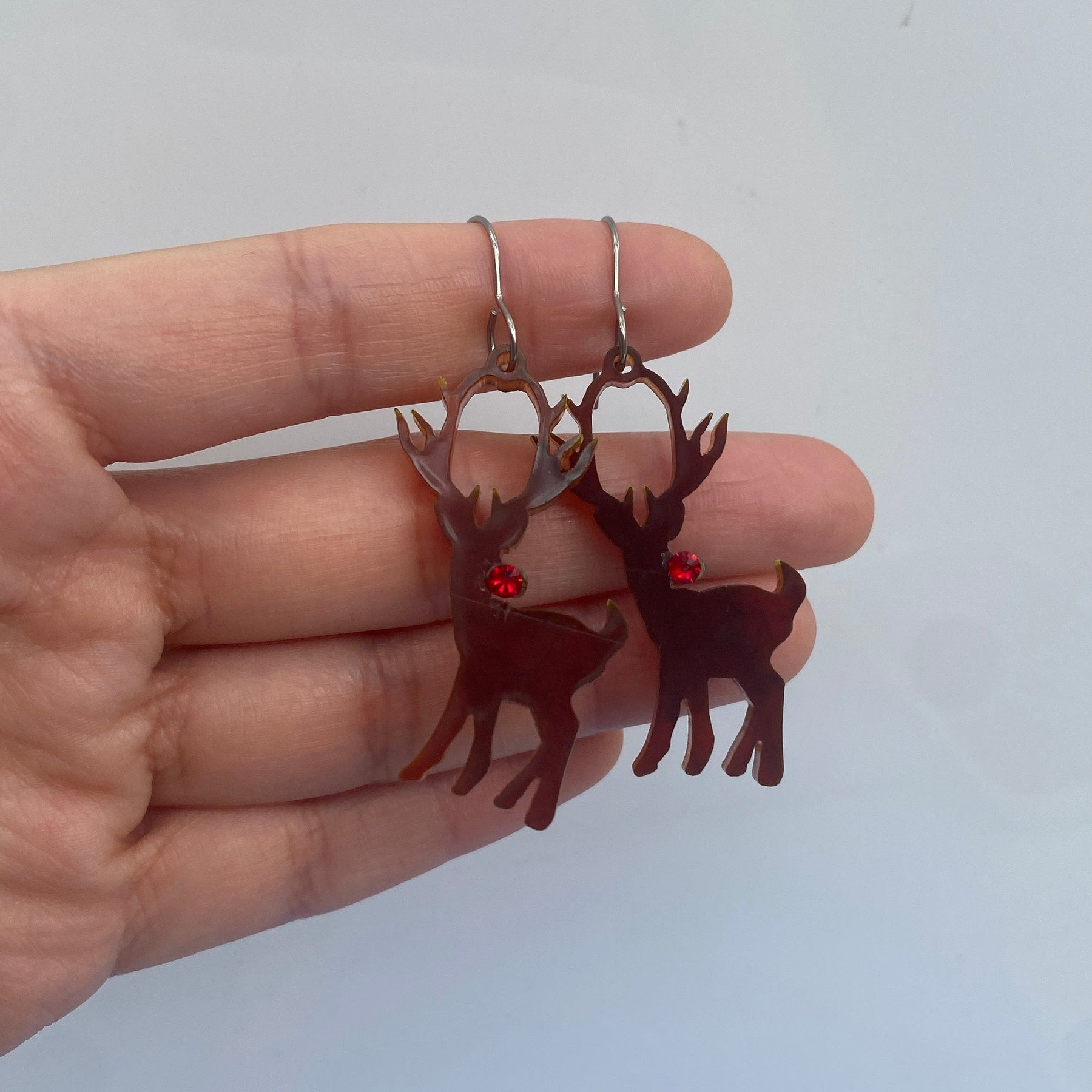 This pair of reindeer hook earrings has slight imperfections.
